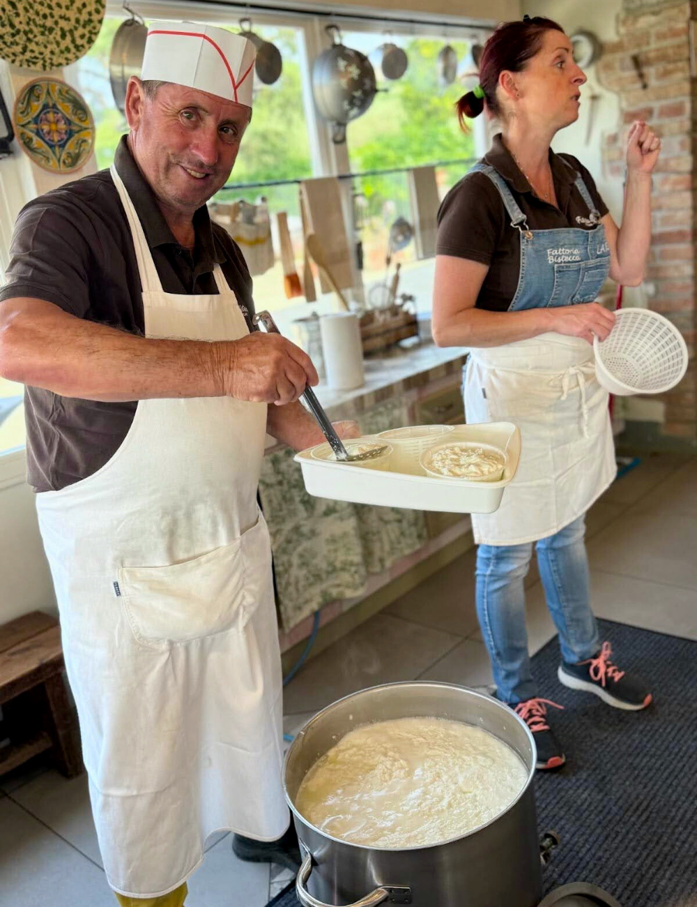 Comenzamos con una visita a la granja bajo un sol radiante, entre ovejas felices y el aroma de la leche caliente. Dentro de la granja, Ilaria calentó lentamente la leche de oveja a 22°C y añadió cuajo, solo 0.5 gramos por cada 10 litros (L).