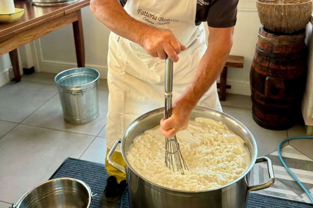 Lapo remueve el raviggiolo, iniciando el proceso de elaboración del pecorino. Foto cortesía de la autora.