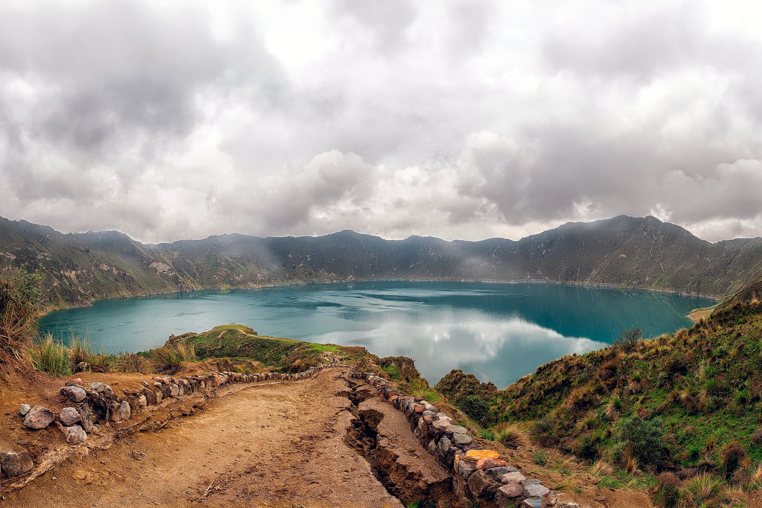 Crater lake surrounded by steep Andean mountains and lush highland vegetation under a cloudy sky, likely depicting Quilotoa in Ecuador.